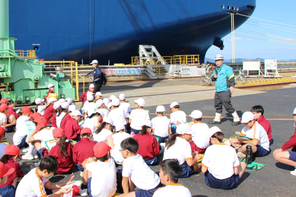 児童たちは、ジブクレーンの大きさや約200mの自動車運搬船を見て、そのスケールの大きさに驚いていました。